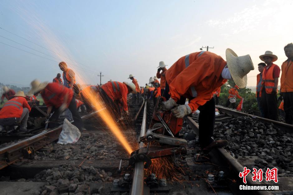 图为凌晨5时55分,南昌铁路局鹰潭工务段职工开始拆旧作业,对旧铁轨进行切割。 刘占昆 摄