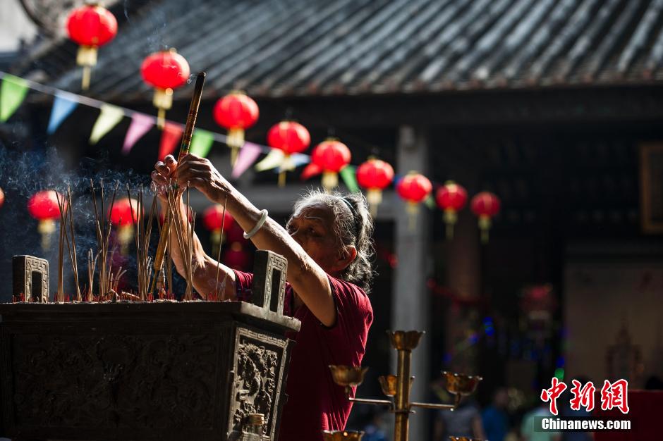 7月29日,广州珠村明德堂,年近八旬的巧娘群婆婆在祠堂前上香祈福。七夕将至,有“中国乞巧之乡”之称的广州珠村迎来“摆七娘”的传统活动,吸引了大批民众前往参观。中新社发 龙宇阳 摄