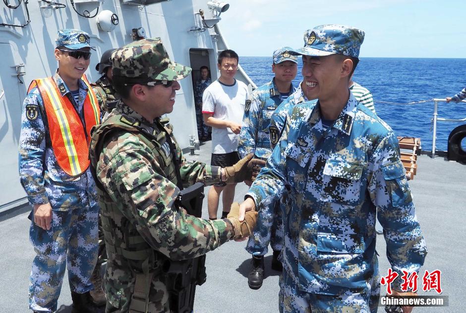 当地时间7月29日, “环太平洋-2014”演习海上演习阶段进入最后一天,中国参演舰艇编队导弹驱逐舰海口舰与墨西哥革命号护卫舰相互进行小艇突击与临检拿捕科目演练。 图为墨西哥革命号护卫舰舰员在海口舰演练后与舰员握手道别。 中新社发 毛建军 摄