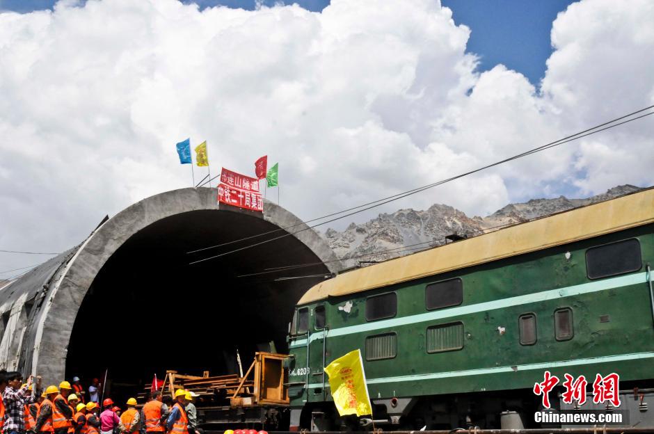 7月30日中午,中铁二十局的工人的祁连山一号隧道口庆祝顺利铺轨。当日,兰州至新疆铁路客运专线祁连山一号隧道内最后两根长轨顺利到位并准备开始连接,这标志着兰新客专甘青段铺轨任务即将全面完成,同时也标志着兰新客专全线铺轨即将全面完成,8月份兰新客专甘肃青海段将进入联调联试实施阶段。胡友军 摄