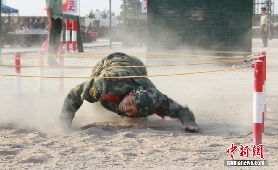7月30日,甘肃武警某部着眼实战化要求,开展多项以军事科目为对抗竞赛内容的练兵活动,在炎热的天气中摔打,提升部队能打仗、打胜仗能力,用过硬的军事素质和优异的训练成绩向“八一”献礼。图为一名战士在竞赛中快速通过铁丝网。吴希会 摄
