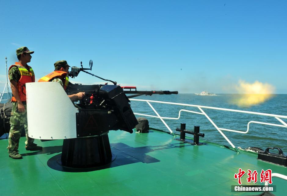 7月28日至31日,福建海警一支队调集7艘舰艇在福州罗源湾锚地开展为期4天的锚地集训暨军事业务大比武。这是该支队今年以来最大规模的一次海上演练,以提升部队协同作战能力和执法执勤综合水平。图为福建海警一支队官兵正在进行14.5高射机枪射击训练。 中新社发 沈灿煌 摄