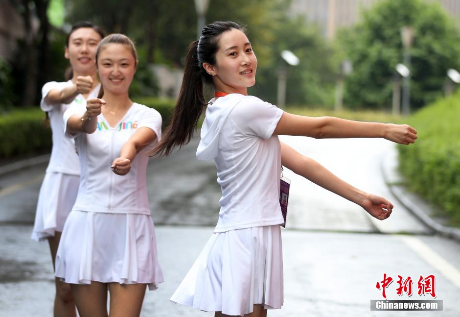 8月1日,南京青奥会开闭幕式引导员们在奥体中心进行训练。随着南京青奥会即将开幕,来自南京各大中院校的205名礼仪引导员正冒着酷暑忙着训练,她们将以最甜美的笑容举着牌子带领各个代表队入场,向世界展示她们的青春风采。中新社发 泱波 摄