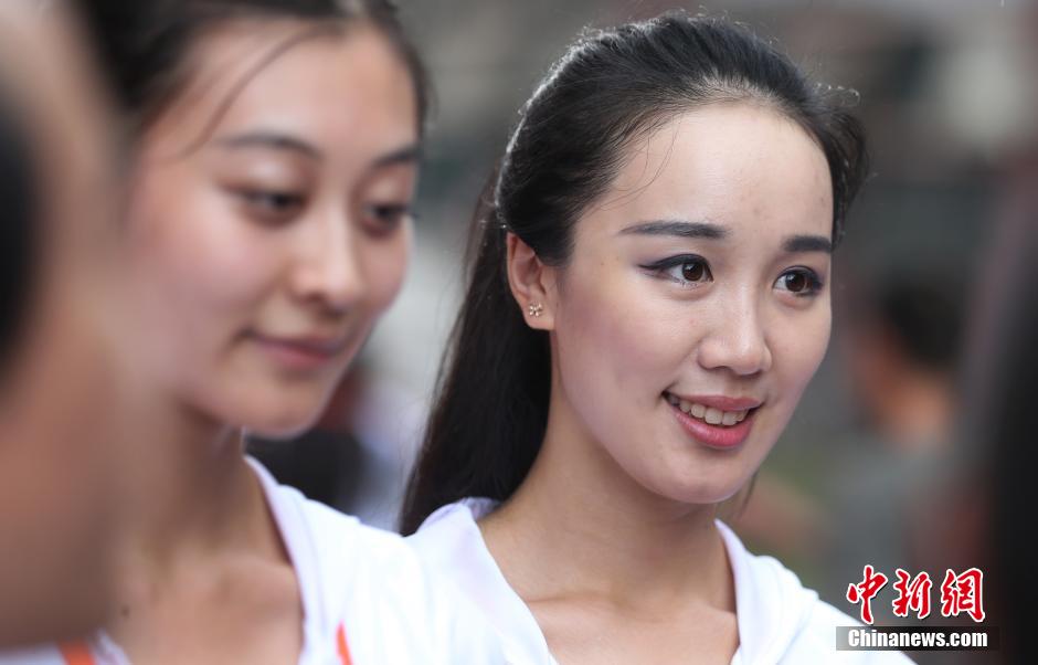 8月1日,南京青奥会开闭幕式引导员们在奥体中心进行训练。随着南京青奥会即将开幕,来自南京各大中院校的205名礼仪引导员正冒着酷暑忙着训练,她们将以最甜美的笑容举着牌子带领各个代表队入场,向世界展示她们的青春风采。中新社发 泱波 摄