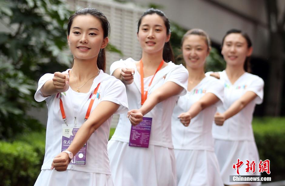 8月1日,南京青奥会开闭幕式引导员们在奥体中心进行训练。随着南京青奥会即将开幕,来自南京各大中院校的205名礼仪引导员正冒着酷暑忙着训练,她们将以最甜美的笑容举着牌子带领各个代表队入场,向世界展示她们的青春风采。中新社发 泱波 摄