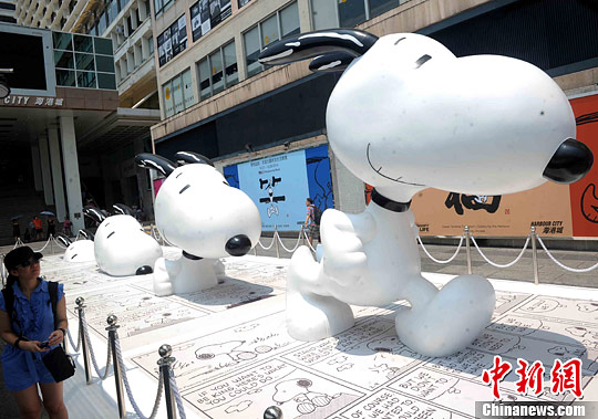 8月1日,有游人与卡通人物史诺比合照。全球最大3.3米高史诺比巨型艺术装置现身香港海港城。中新社发 谭达明 摄