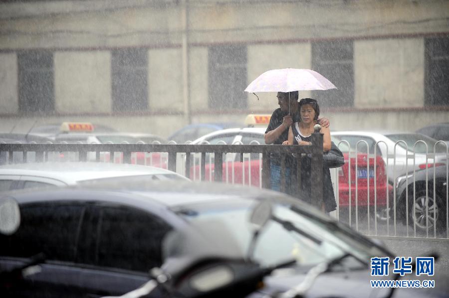 8月4日,在山西太原,市民在雨中等待。新华社记者 范敏达 摄
