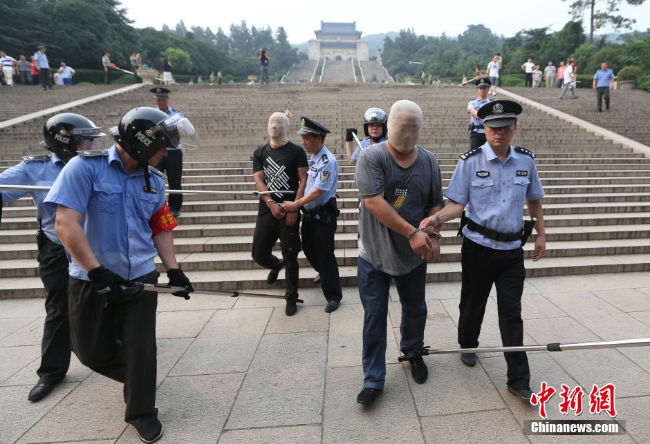 8月4日,南京中山陵园管理局联合驻区公安、武警等相关单位,举行了一场“防恐”实战演练,在“天下为公”陵门后的台阶上,两名持刀歹徒从碑亭旁的树林中冲出并劫持了数名游客,中山陵园管理局突发事件应急中心接报后,立即启动预案。“110、119、120”多部门联动,2分钟后,景区突发事件应急处置分队到达现场,并展开解救人质行动。防恐队员一边向歹徒喊话分散其注意力,一边趁歹徒不备一拥而上将其制服,人质被成功解救。15分钟后,旅游秩序恢复正常。据悉,应急处置分队目前配备防暴头盔、防割手套、腰叉、脚叉等,从8月6日起至“青奥会”结束,每天在中山陵景区等重点区域进行巡逻检查,严防暴恐活动和个人极端事件发生。 中新社发 泱波 摄