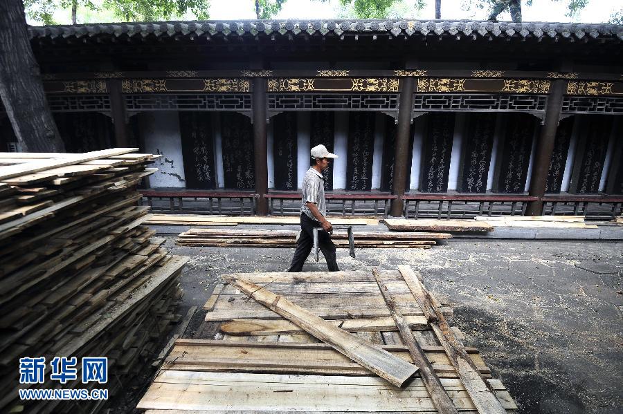 8月4日,在太原市碑林公园内,工人在准备建材、工具。近日,维修人员将对太原市碑林公园内的部分地面和碑石进行修缮保护。太原市碑林公园是山西省第一家五星级城市公园和国家重点公园,藏有书法碑刻418通,其中222通为明末清初时我国伟大思想家、艺术家傅山先生所作。据园方介绍,因年久失修,园内所陈列的部分碑石表面已出现风化,且碑体基础下沉,直接影响碑林风貌且造成很大的安全隐患。新华社记者 范敏达 摄