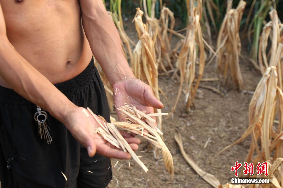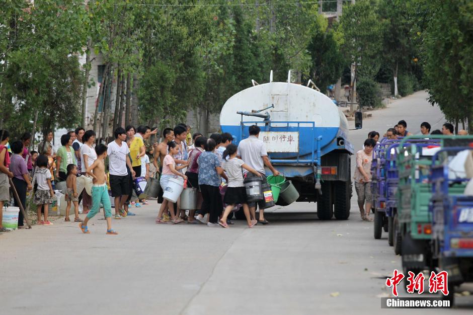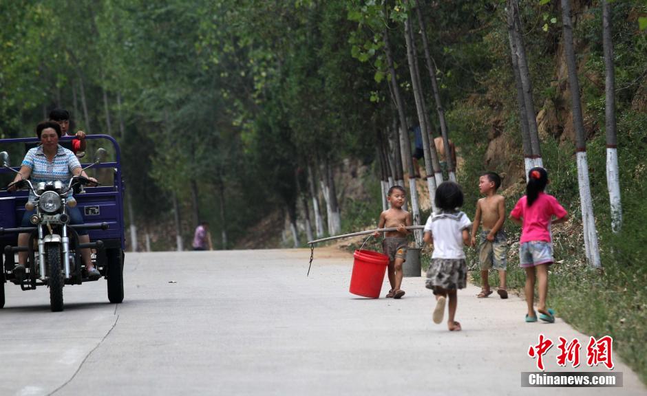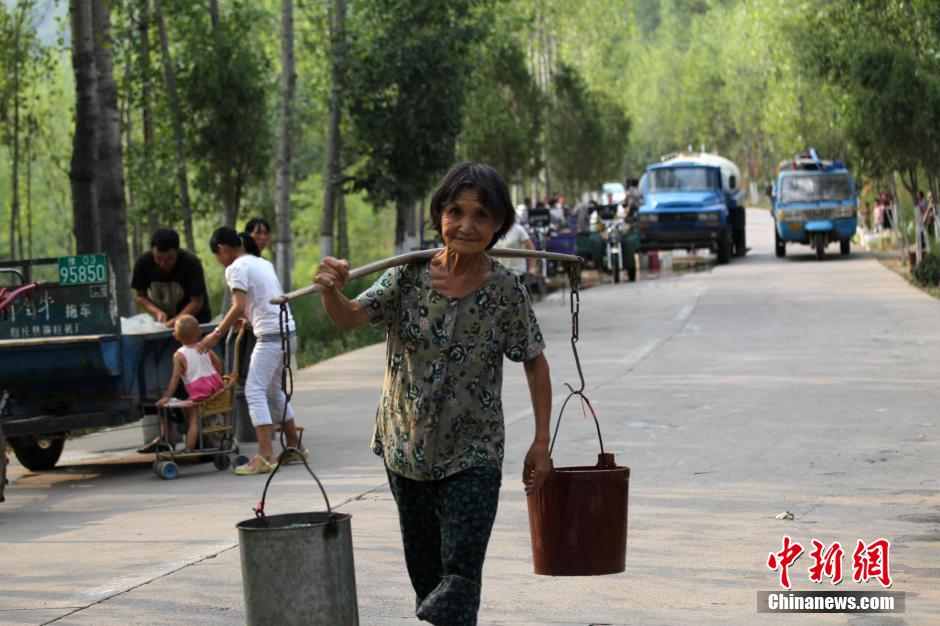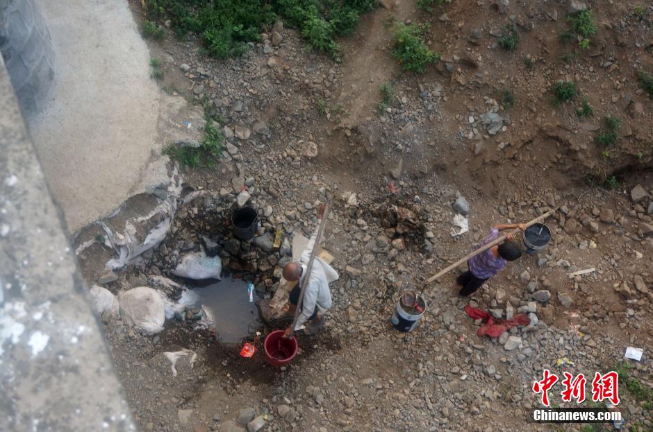8月4日,河南嵩县纸房镇龙头村,六旬老太在断流的大桥下,等待石头缝里渗水。河南正遭遇63年来最严重的“夏旱”,秋粮受旱面积已达2583万亩,其中严重干旱739万亩,超过74.2万人出现临时性饮水困难,全省多地供水告急。地处伏牛山北麓及其支脉的嵩县尤甚,嵩县全县三大河流中白河、汝河已断流,一级支流全部断流,全县31座小型水库,目前干涸15座,其中4座处于死水位,全县948眼机电井,775眼出水不足,15万亩农作物因干旱绝收,出现吃水困难的农户靠抓阄取水。 中新社发 王中举 摄