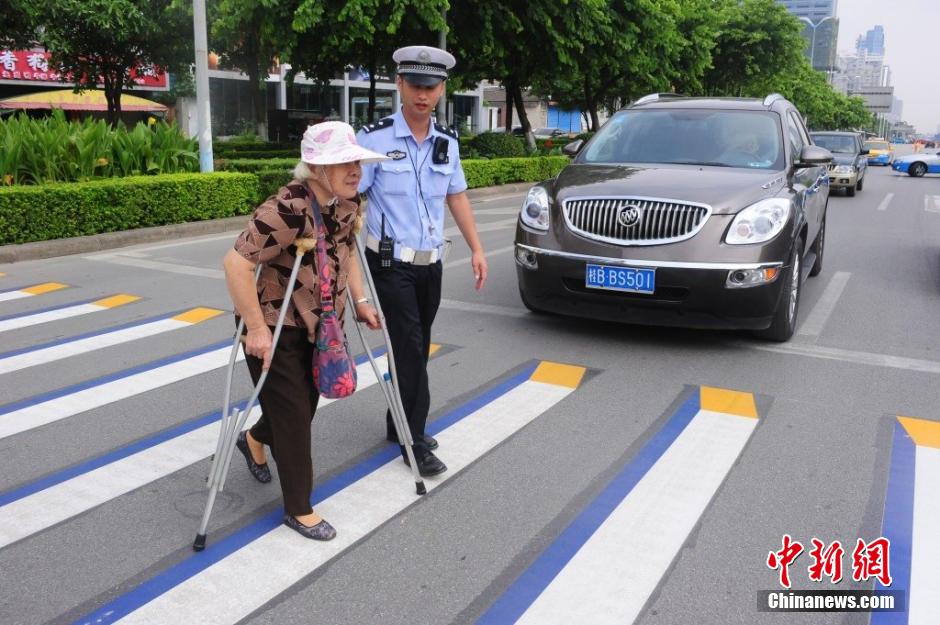 8月4日,在广西柳州市桂中大道和文华路交叉路口人流、车流密集区域,出现了一条长5米的3D立体效果的彩色斑马线,提醒来往的车辆礼让行人、文明行车,这也是广西第一条3D彩色斑马线。3D彩色斑马线由交通标识的常用颜色白、黄、蓝组成以凸显立体的视觉冲击,2010年首次出现在浙江台州,现已在兰州、杭州、南京、昭通、石家庄、济南、金华等多个地市出现。王运鹏 摄