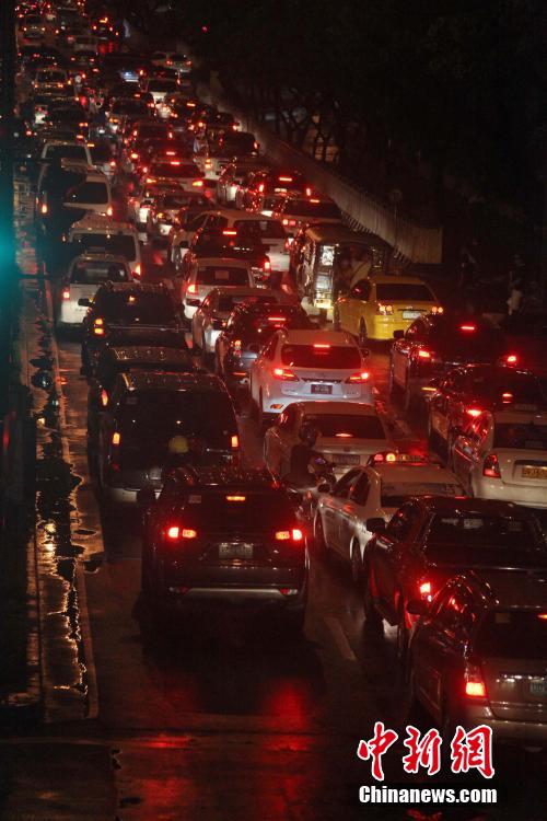 8月4日,菲律宾首都大马尼拉地区持续大雨,造成当地交通大面积拥堵。图为当晚在菲律宾首都大马尼拉地区马卡蒂市一条大街上排起的长长车龙。 中新社发 张明 摄