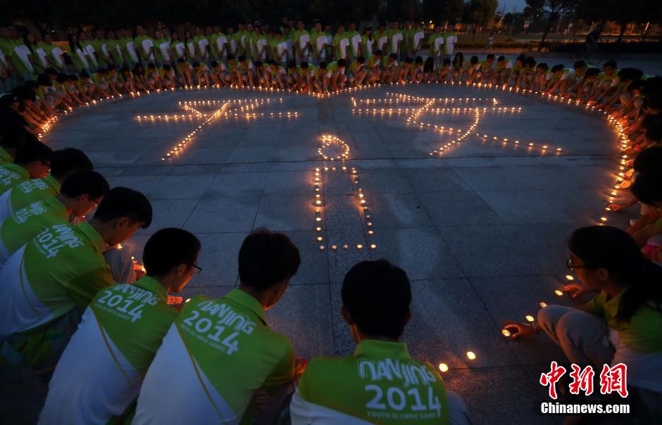 8月4日晚,南京东南大学800名青奥志愿者经过系统培训后庄严宣誓出征青奥会,在仪式结束后点燃蜡烛,为近日昆山爆炸、云南地震中的伤亡者祈福。据悉,他们其中500名志愿者将以NOC助理的志愿者身份服务204个国家和地区的奥委会主席团和所有随团运动员,另有300名志愿者全程服务本届青奥会的示范场馆—龙江体育馆,承担该馆的礼宾、语言服务、竞赛组。中新社发 泱波 摄
