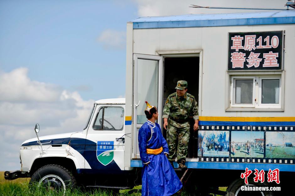 8月4日,在内蒙古新巴尔虎左旗的牧区草原上,第一边防大队结合多年牧区边境管理服务的经验,率先推行了草原110“三务合一”工作模式。该模式以警务室为载体,融党务,村务,警务于社会服务中,以牧区社会管理现状为前提,以民警兼任村官工作为基础,充分发挥草原110警务室作用,使牧区的流动警务室成为党群之间的联络员、政府服务的办公点、群众困难的求助站,打造全新模式的“一站式”高效化的社会服务。图为内蒙古新巴尔虎左旗牧区草原上的诺门罕布日德边防派出所民警朝鲁门指导牧民呼日查监察草原牧区情况。中新社发 陆欣 摄