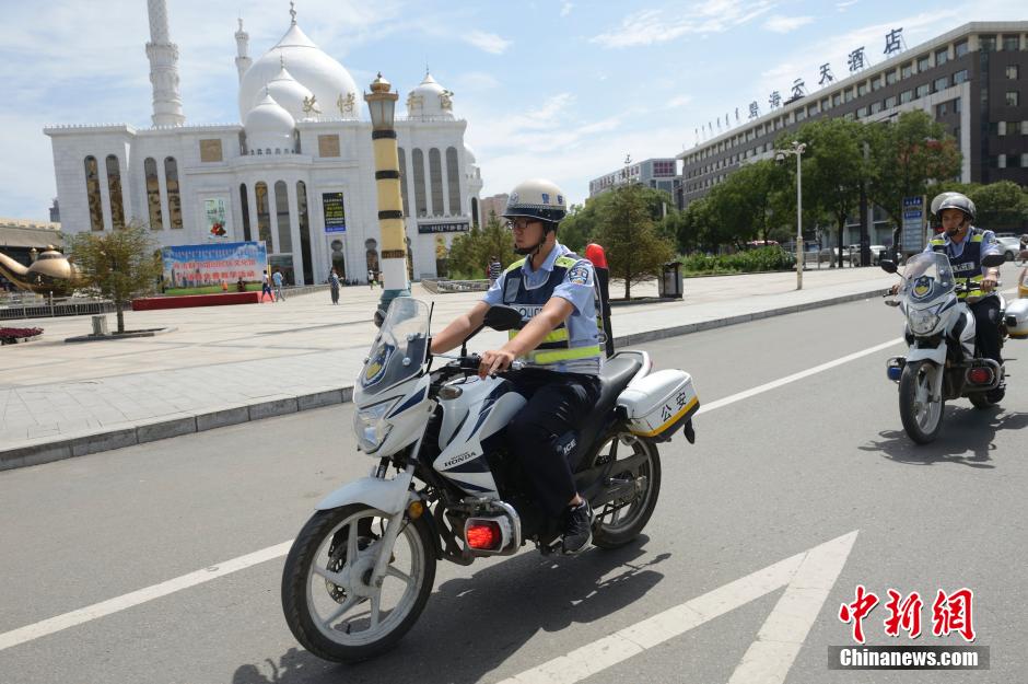8月5日,公安交警骑行新配发的摩托车在街头巡逻。近日,内蒙古自治区公安厅出资300余万元向呼市公安局配发20辆敞篷武装巡逻车和30辆警用摩托车,加强社会面防控和反恐工作。 中新社发 刘文华 摄