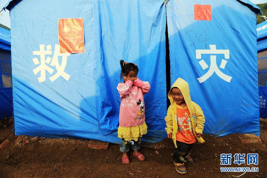 8月6日,今年4岁的谢文佳和妹妹谢宏辉在帐篷门口玩耍。新华社记者 邢广利摄