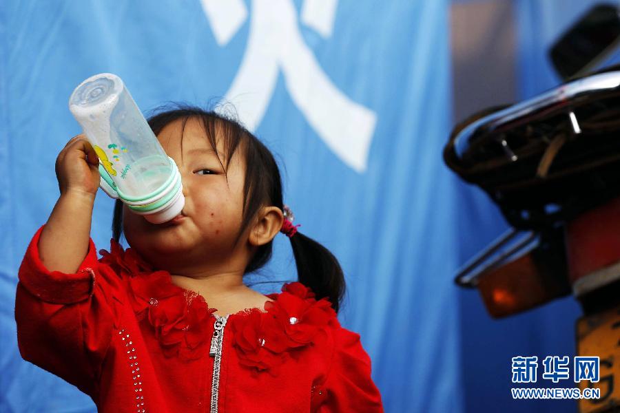 8月6日,今年一岁半的罗雨涵在帐篷前喝奶。新华社记者 邢广利摄