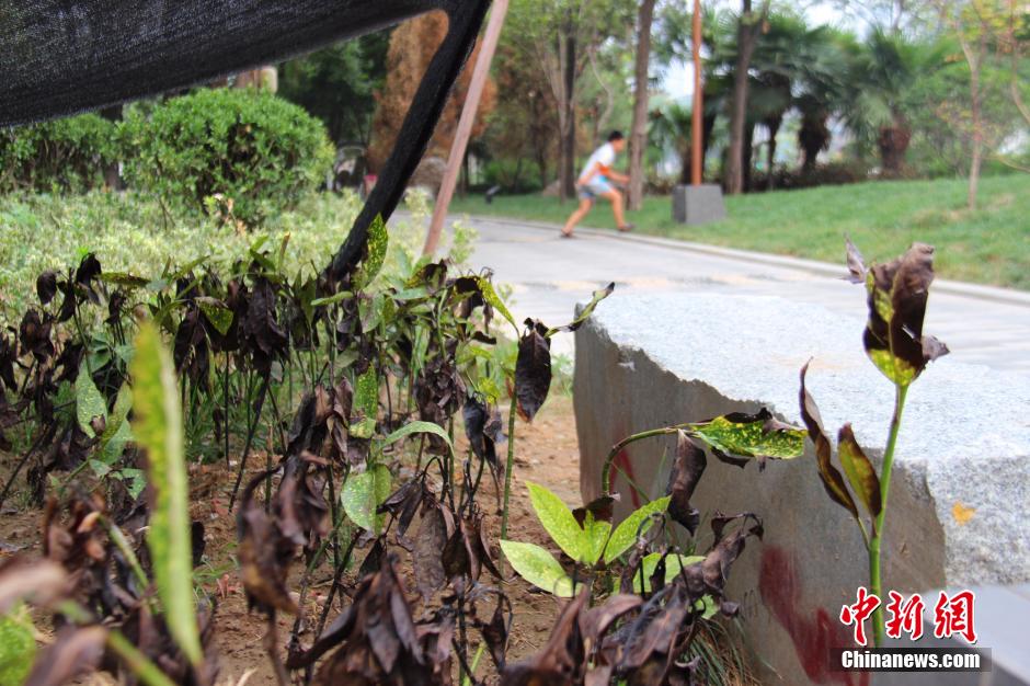 入伏以来,西安遭遇罕见旱灾,陆续发布橙色高温预警和红色高温预警。记者6日在西安护城河沿岸公园看到,部分树木植被由于干旱缺水,已经干枯,甚至死亡。尽管工作人员每天给沿岸树木和草类浇水,给部分植被搭遮阴网,但由于干旱严重,仍有部分植被出现枯死现象。持续干旱导致西安护城河公园部分树木干枯。冀浩凡 摄