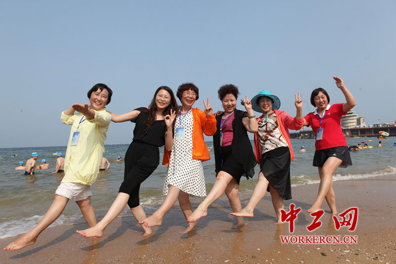 2014年8月7日下午,在北戴河休养的劳模们来到海滨浴场海浴。参加休养的不少劳模来自内陆城市,还有的来自大山深处。第一次见到大海,他们兴奋地奔向大海,尽情享受沙滩、阳光。图为劳模们在浴场内留影。中工网记者 范治林 摄