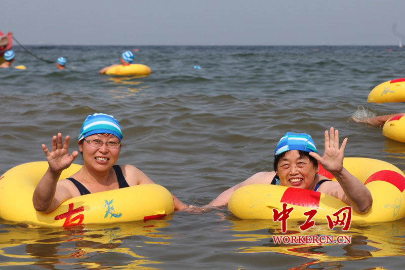 2014年8月7日下午,在北戴河休养的劳模们来到海滨浴场海浴。参加休养的不少劳模来自内陆城市,有的来自大山深处,第一次见到大海,他们兴奋地奔向大海,尽情享受沙滩、阳光。中工网记者 范治林 摄