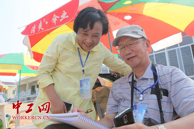 2014年8月7日下午,在北戴河休养的劳模们来到海滨浴场海浴。参加休养的不少劳模来自内陆城市,还有的来自大山深处。第一次见到大海,他们兴奋地奔向大海,尽情享受沙滩、阳光。图为来自云南艺术学院的孙建东教授(右)在浴场内速写。中工网记者 范治林 摄