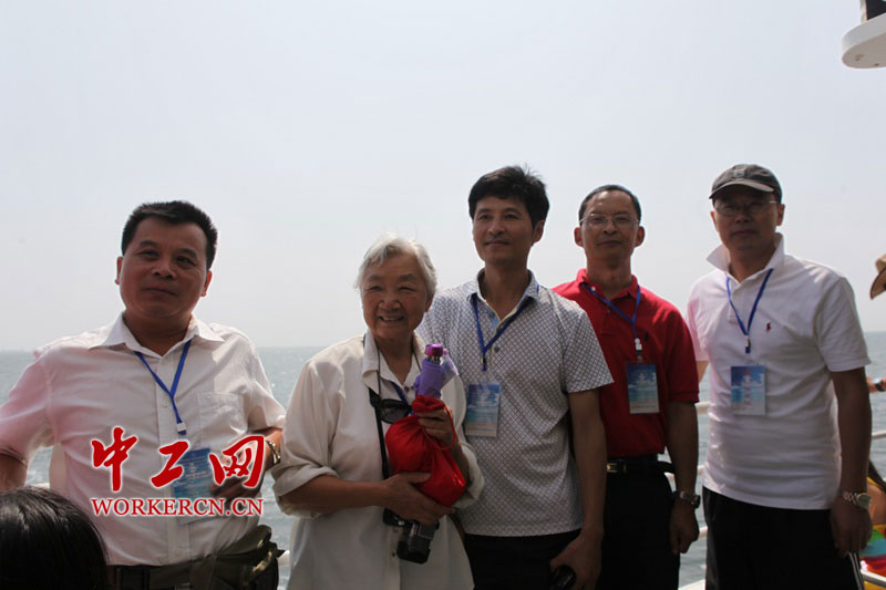 2014年8月7日上午,80余名来自全国教育系统劳模游览北戴河鸽子窝公园,随后乘坐“长城号”游轮海上观光。图为劳模们在“长城号”游轮上留影。中工网记者 范治林 摄
