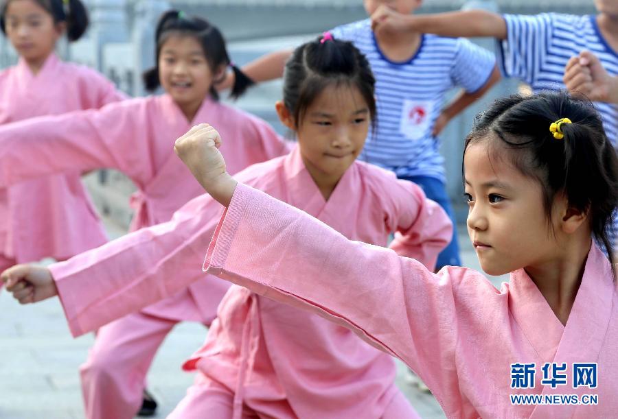 8月7日清晨,在沧州市运河边,参加文武夏令营的小班学生在武师指导下练习八极拳。暑假期间,河北省沧州市运河区大运河孔子学堂主办的“文武夏令营”吸引了近百名青少年参加,孩子们在这里学习《论语》、《弟子规》等国学经典,还在武师的指导下练习八极拳、五步拳等,学习传统文化,丰富暑期生活。新华社发(傅新春 摄)