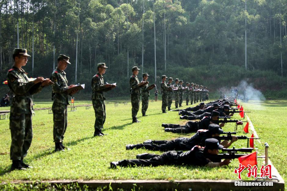8月7日,广西壮族自治区各地市公安局、武警广西总队、公安边防总队等16个单位在南宁参加“八桂·2014”反恐演练,借此提高和检验各部门反恐应急的能力和水平。据悉,此次反恐演练内容主要是处置爆炸恐怖袭击和实战射击2个科目。图为参演人员进行射击演练。中新社发 陈尚满 摄