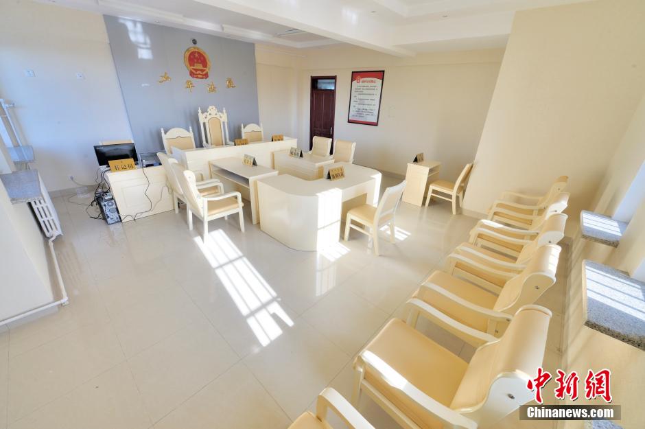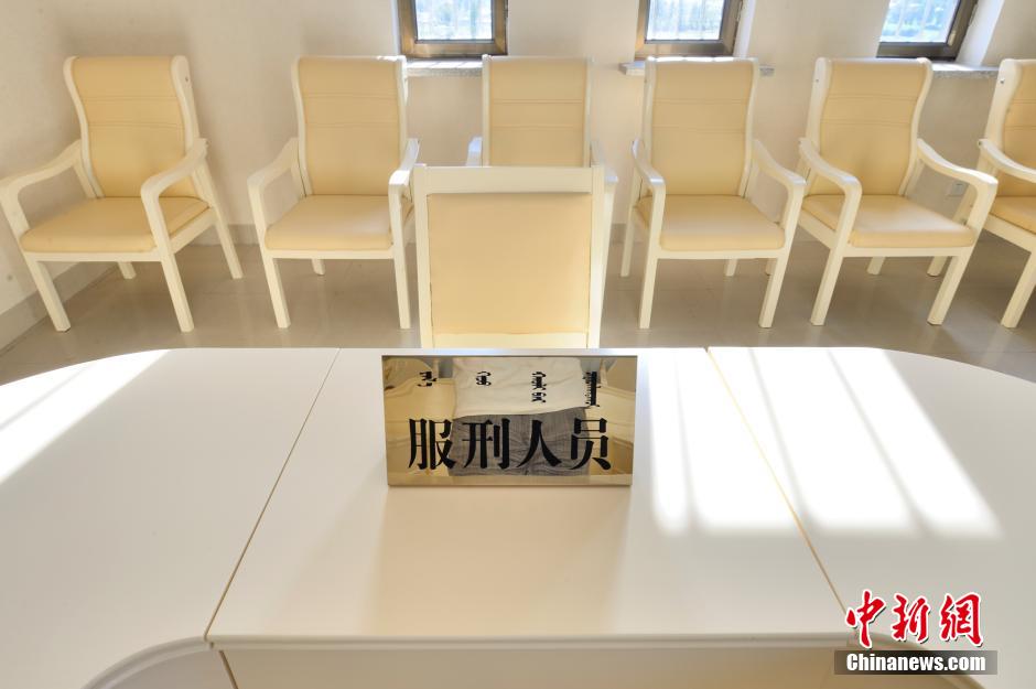 8月7日,内蒙古首家监所内少年审判法庭内景。近日,内蒙古未管所未成年犯审判法庭接匾,成为内蒙古首家监所内少年审判法庭。相比成人法庭的严肃,少年审判法庭则突出法院的爱心,设计时考虑到减轻未成年人的恐惧与抵触心理,内部桌椅及墙壁颜色采用乳黄色设计,法庭主要审理服刑人员的减刑与假释。审判长与审判员的椅子比正常椅子低15厘米,审判长所在法台则只有10厘米高,证人席通常由与被告服刑人员共同服刑的互监小组成员落座,公诉人席换成检察员席,被告人席换成服刑人员席。 中新社发 刘文华 摄