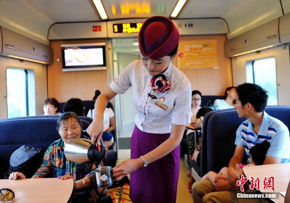 8月8日,兰渝铁路高南线由此正式开通运营,记者登上首发列车D5176次动车,用镜头记录首发动车上乘务员们的值乘生活。图为D5176次动车乘务员为旅客服务瞬间。 安源 摄