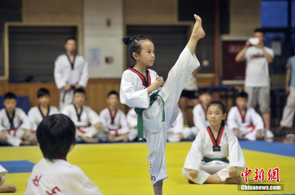 8月10日,2014年全国跆拳道俱乐部联赛在重庆正式开赛。来自重庆、云南、四川、贵州、山西等10个省市的跆拳道俱乐部和培训机构的1468名业余运动员展开角逐。此次大赛为期4天,设竞技、品势、特技等项目。据悉,参赛的运动员年龄最大的18岁,年龄最小的只有6岁。陈超 摄