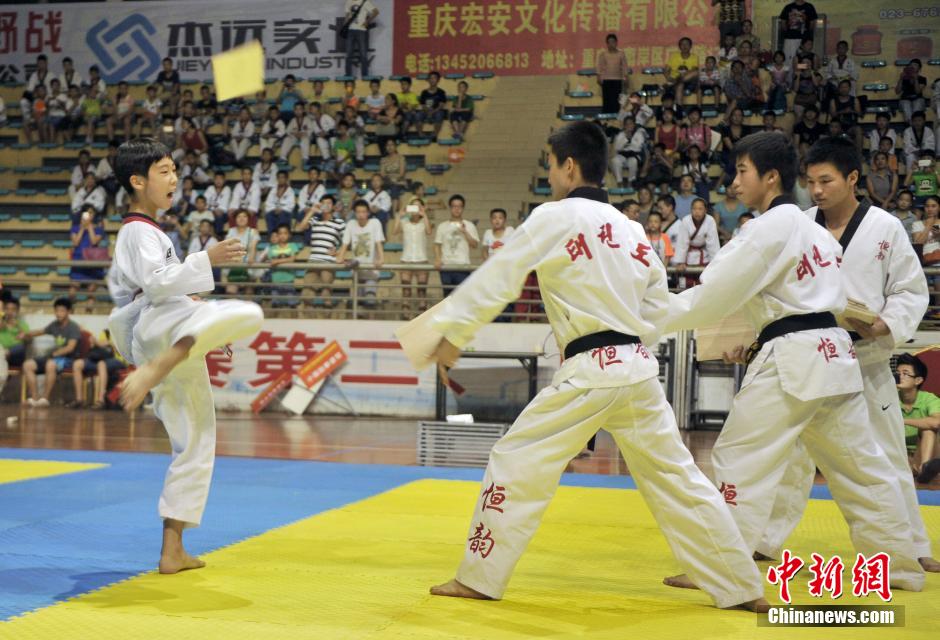 8月10日,2014年全国跆拳道俱乐部联赛在重庆正式开赛。来自重庆、云南、四川、贵州、山西等10个省市的跆拳道俱乐部和培训机构的1468名业余运动员展开角逐。此次大赛为期4天,设竞技、品势、特技等项目。据悉,参赛的运动员年龄最大的18岁,年龄最小的只有6岁。陈超 摄