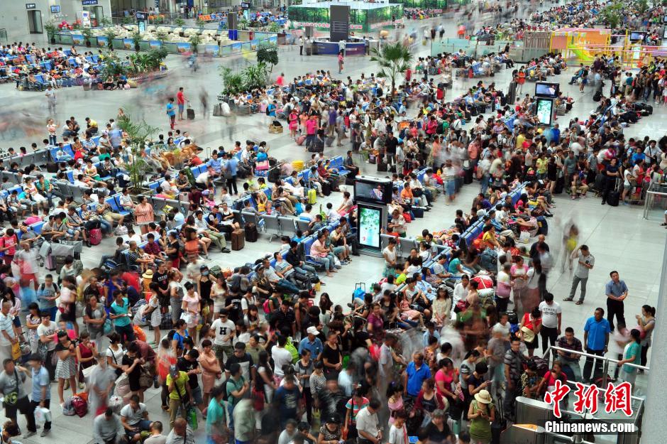 8月9日,旅客在沈阳北站候车。沈阳北站日发旅客近7万人次迎来暑运高峰。7月份,全国铁路客流日均达到731万人,为今年以来最高的一个月,比6月份增加了82万人。中新社发 于海洋 摄