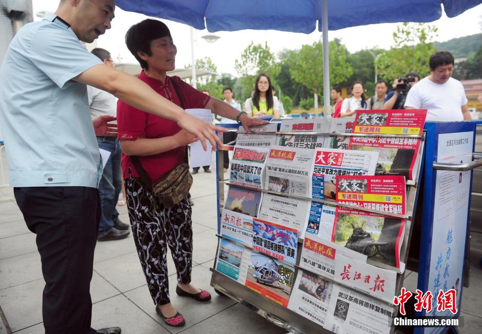 8月11日,首批5台高1米、长1.2米、宽0.6米新型售报车在湖北武汉武昌区武珞路正式上岗。武汉市武昌区城管委将为在武珞路石牌岭至中山路段经营报摊的12家经营户,免费提供该新型售报车。并与先期试点经营的5家报摊经营摊主签订“守法经营承诺书”。即统一车辆、统一标准、规范占道经营,试点时间为期一年。该新型售报车是由武昌区城管员自行设计制造完成的。中新社发 张畅 摄