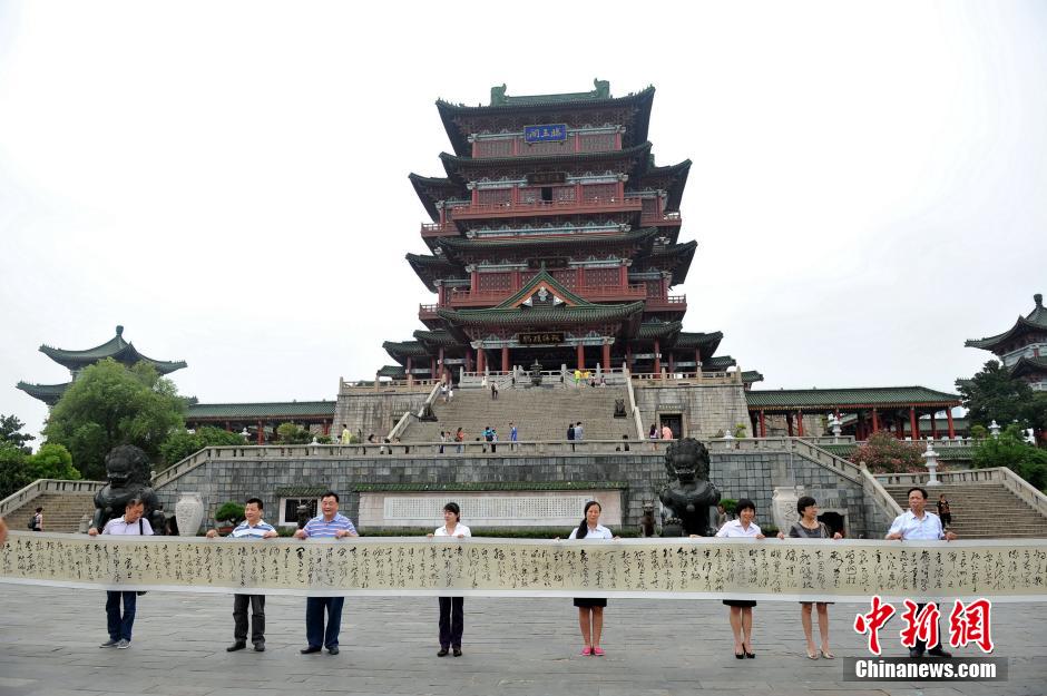 8月12日,中国当代书画名家林立中携其创作的48米长《滕王阁序》行草书法手卷,亮相江南名楼滕王阁景区。滕王阁是中国南方唯一一座皇家建筑,位于江西南昌赣江之畔,它与湖北黄鹤楼、湖南岳阳楼并称为“江南三大名楼”,因初唐才子王勃作《滕王阁序》让其在三楼中最早扬名天下,位于“江南三大名楼”之首。中新社发 刘占昆 摄