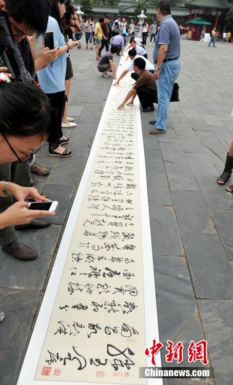 8月12日,中国当代书画名家林立中携其创作的48米长《滕王阁序》行草书法手卷,亮相江南名楼滕王阁景区。滕王阁是中国南方唯一一座皇家建筑,位于江西南昌赣江之畔,它与湖北黄鹤楼、湖南岳阳楼并称为“江南三大名楼”,因初唐才子王勃作《滕王阁序》让其在三楼中最早扬名天下,位于“江南三大名楼”之首。中新社发 刘占昆 摄