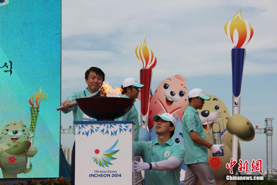12日下午,韩国仁川亚运会火炬在中国威海传递,这是亚运会历史上主办国首次在境外传递火炬,威海市成为此次亚运会火炬传递的唯一中国城市。韩国仁川亚运会组委会秘书长权庆相点燃火炬盆,威海市长张惠点燃第一棒火炬。火炬从威海市幸福门广场开始传递,50名中外火炬手通过手手相传方式,顺利完成总长4.3 公里的火炬传递过程。图为韩国仁川亚运会组委会秘书长权庆相点燃火炬盆。张玉雷 摄
