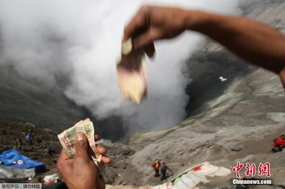 当地时间8月12日,印尼普罗勃灵戈,朝圣者将贡品扔进婆罗摩火山火山口,向山神达尼亚-卡萨达致意,庆祝卡萨卡节。每年,民众都会准备大米、果蔬、牲畜以及钱等作为贡品,向山神达尼亚-卡萨达致意,祈求保佑和丰收。这一庆祝仪式大约持续一个月。