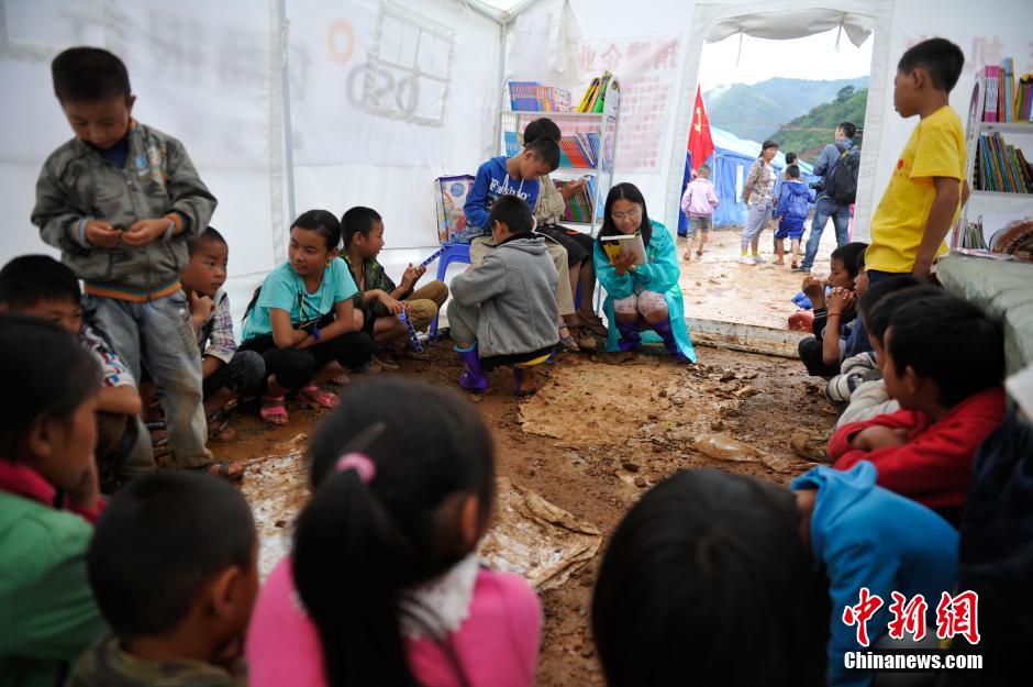 8月12日,一名公益组织的社工在龙头山镇灾民安置点为孩子讲故事。刘冉阳 摄