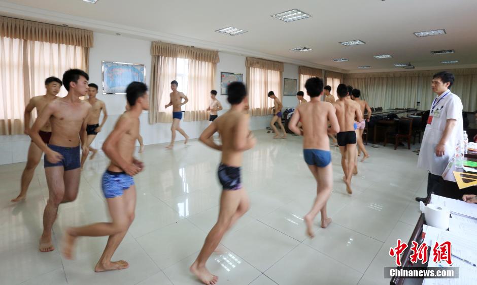 8月12日,在广西融安县武装部兵站,医务人员在对适龄青年进行外科身体检查。当日,融安县2014年夏秋季征兵体检工作正式启动,372名通过初检、初审的适龄青年在县人民武装部兵站进行外科、内科、口腔科、视力、心理测试等20余项目内容身体检查。据了解,今年征兵将实行新的体检标准,身高、体重、视力都有所放宽;对原来的政治审查程序进行简化,主要以适龄青年近年的实际表现为主。全国征兵网对大学生及高校新生报名时间将延长至8月25号。谭凯兴 摄