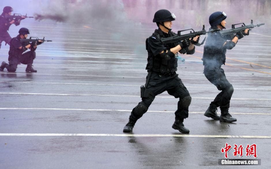 8月12日,四川省达州市组织公安、武警、民兵及卫生系统等多部门在市公交公司举行联合反暴恐处突拉动演练功。本次演练采取“不设预案、不打招呼、不搞预演、贴近实战”的形式进行,接警后,现场指挥长立刻下达指令,启动应急预案,市局特警支队、巡警支队、应急处突预备队、交警支队等部门人员火速赶赴现场。队伍现场集结完毕后,还进行了反暴恐科目实战演示:公安技能教官、特警队员合演了《枪械实战操作》,武警支队表演了《战术基础动作》,公安特警表演了《小组战术掩护队形》,公安特警和武警官兵合演了《暴恐事件现场处置》。曾猛 摄