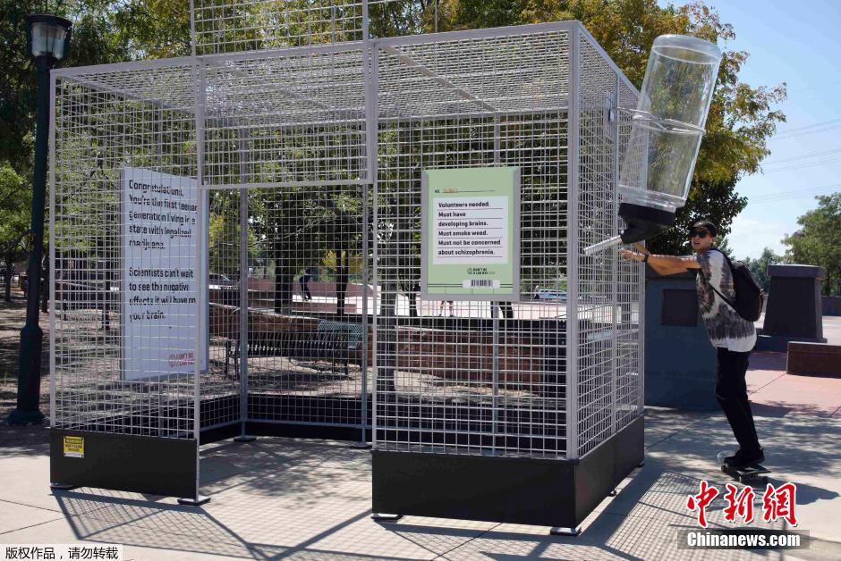 当地时间8月12日,美国丹佛图书馆外、公园等地设置巨型实验室老鼠笼,提醒年龄在12岁到15岁的年轻人远离大麻,避免遭其毒害,成为实验室的小白鼠。这项活动由科罗拉多州州长办公室暂住,斥资200万美元,警醒世人大麻的危害。