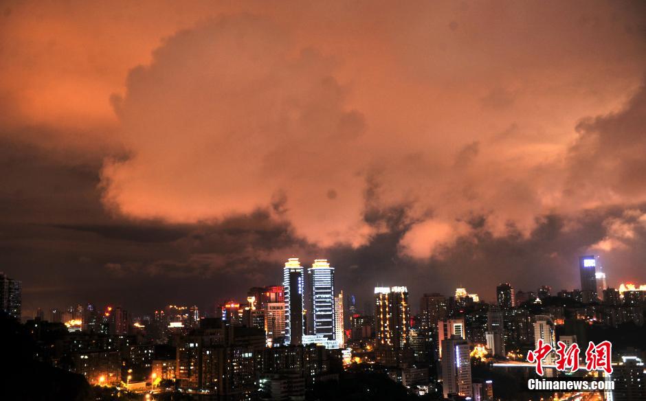 8月12日晚,雨过天晴,重庆主城上空形成厚厚的云层,在城市五颜六色的灯光映照下形成一道美丽的风景线。 中新社发 陈超 摄