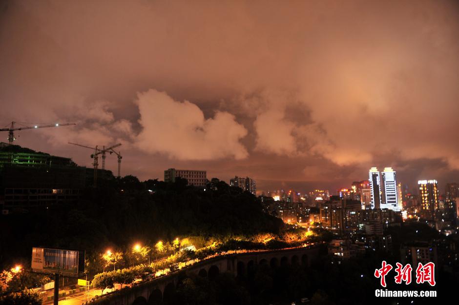 8月12日晚,雨过天晴,重庆主城上空形成厚厚的云层,在城市五颜六色的灯光映照下形成一道美丽的风景线。 中新社发 陈超 摄