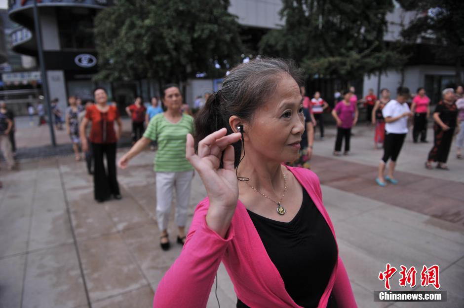8月13日,重庆江北区观音桥步行街上大妈们戴着耳机跳坝坝舞。为有效缓解坝坝舞的噪音扰民问题,观音桥商圈试点“无声舞蹈”锻炼方式,选取63名经常舞蹈锻炼的市民,免费为他们发放无线耳机,通过定向发射器播放舞蹈背景音乐,将坝坝舞由“噪音模式”转变到“静音模式”。图为市民戴着耳机跳舞。 陈超 摄