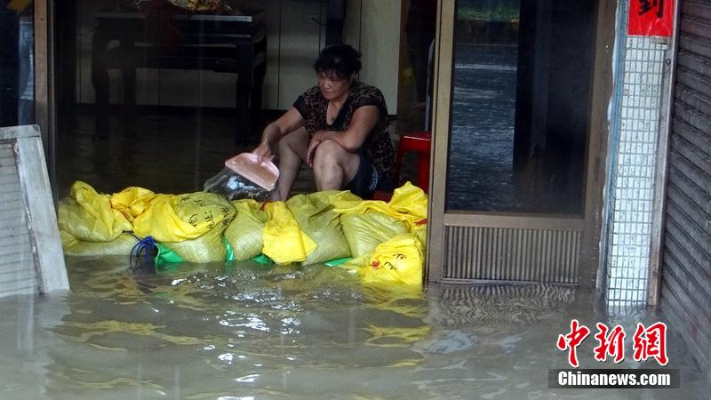 2014年8月12日,台19省道台南安定新吉一带,道路成“水路”,居民筑沙包难挡恶水,只能拚命将水往外舀出,相当无奈。