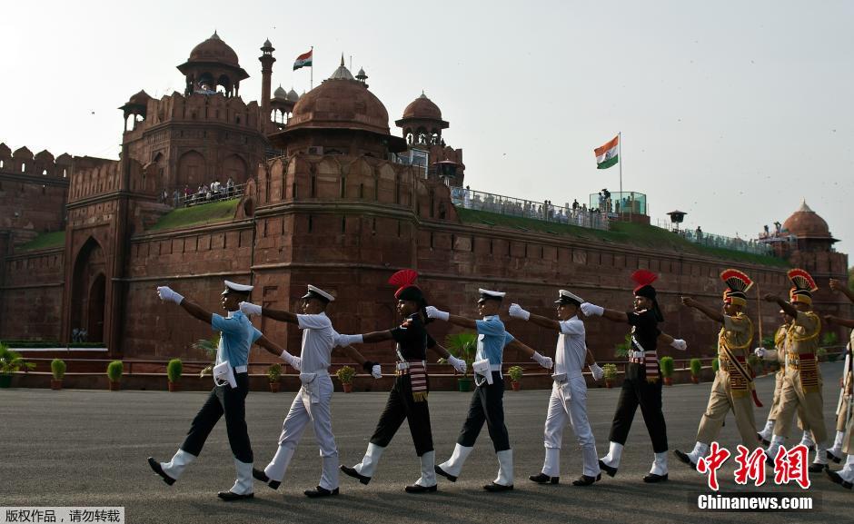 当地时间8月13日,印度士兵在新德里为庆祝第68个独立日进行阅兵彩排。