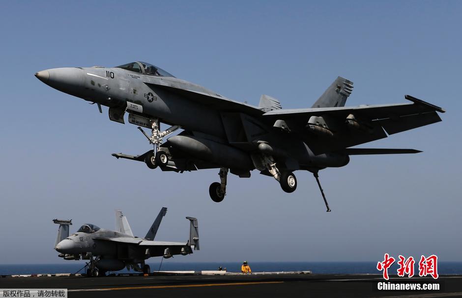 当地时间8月12日,海湾地区,美国F/A-18C“大黄蜂”等战斗机从“布什号”航空母舰上起飞对伊拉克伊斯兰极端分子控制地区进行空袭。图为F/A-18E“超级大黄蜂”战机准备在航母上降落。