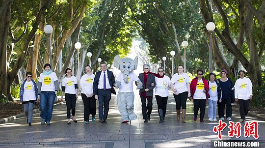 8月13日,悉尼市政府与澳大利亚阿尔茨海默症(又称老年痴呆症)协会携手宣传行走对身体健康带来的益处,提高民众预防老年痴呆症的意识。目前全澳约有 332,000人患有痴呆症,悉尼市内有约1,100人患此病症,且这一数字持上升趋势。悉尼市副市长凯麦斯呼吁市民和上班族踊跃参加“为记忆步行和慢跑”活动,减缓人们大脑衰老,促进延年益寿。图为该活动主办方在悉尼举行的呼吁市民行走预防老年痴呆症宣传活动。中新社发 钟欣 摄