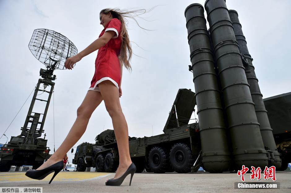 当地时间2014年8月13日,俄罗斯茹科夫斯基,俄罗斯Oboronexpo 2014军备展在当地举行,俄罗斯军方防空系统S-400“凯旋”防空导弹系统亮相。图为红衣美女走过S-400“凯旋”防空导弹系统。